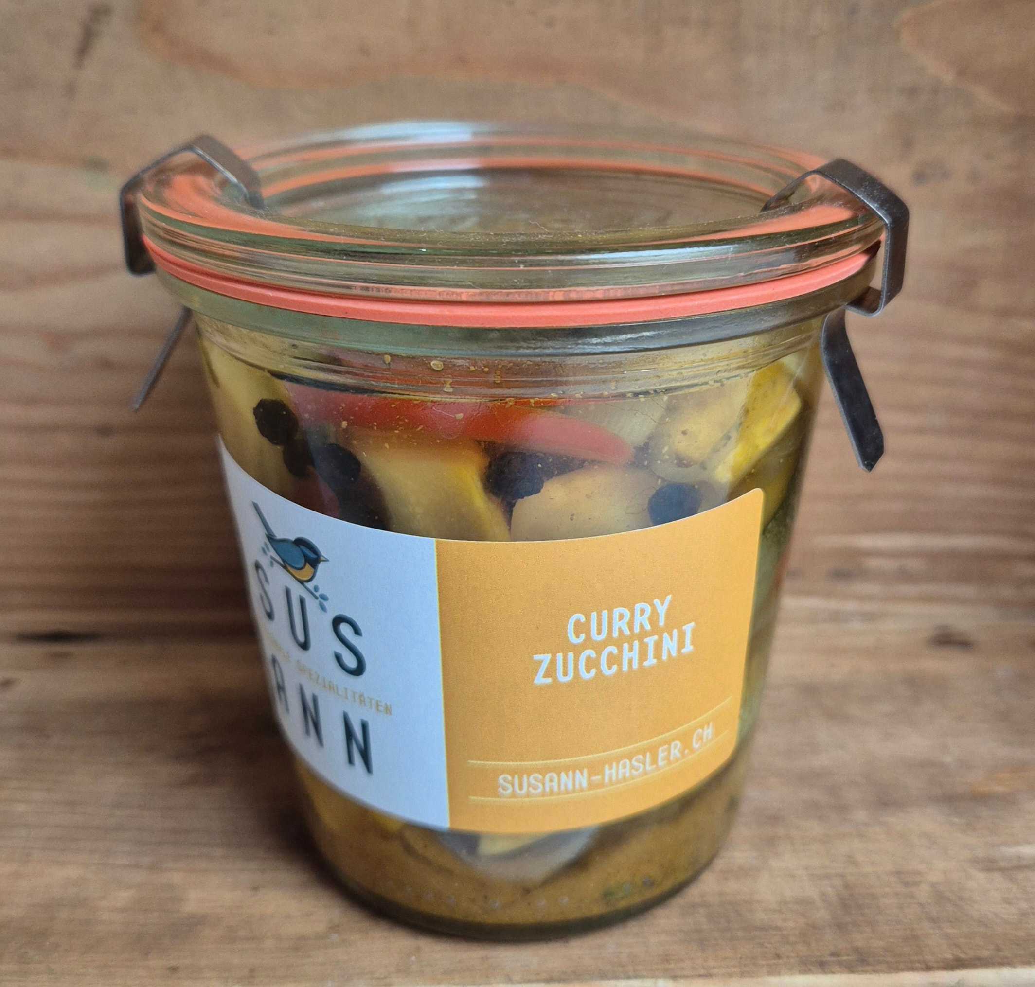 Zutaten (*CH) : *Zucchini, Bio-Kräuteressig, *Wasser, *Zwiebeln, *Zucker, *Peperoni, Meersalz, Curry, Pfefferkörner