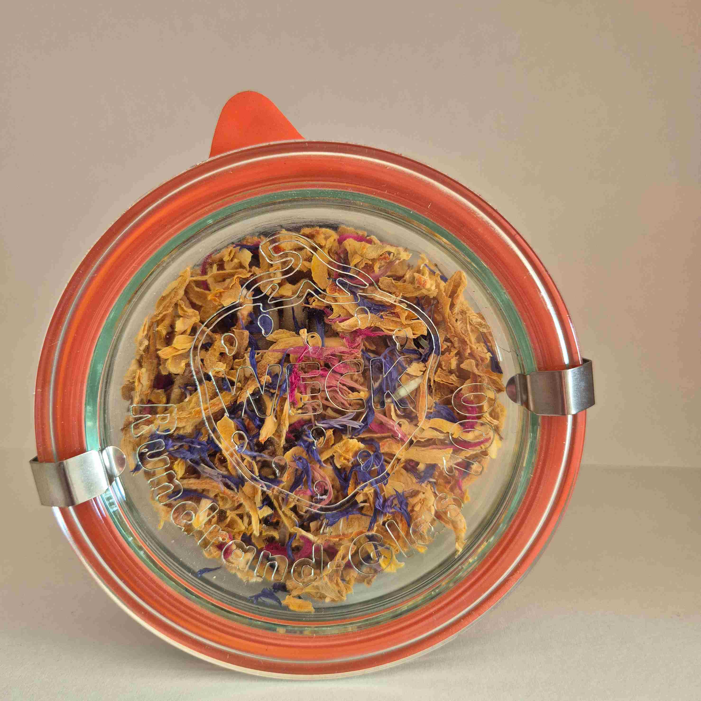 Dinkel Hörnli (Mühle Kleeb), Kürbis, Zwiebeln, Thymian, Goldmelisse, Kornblumen.