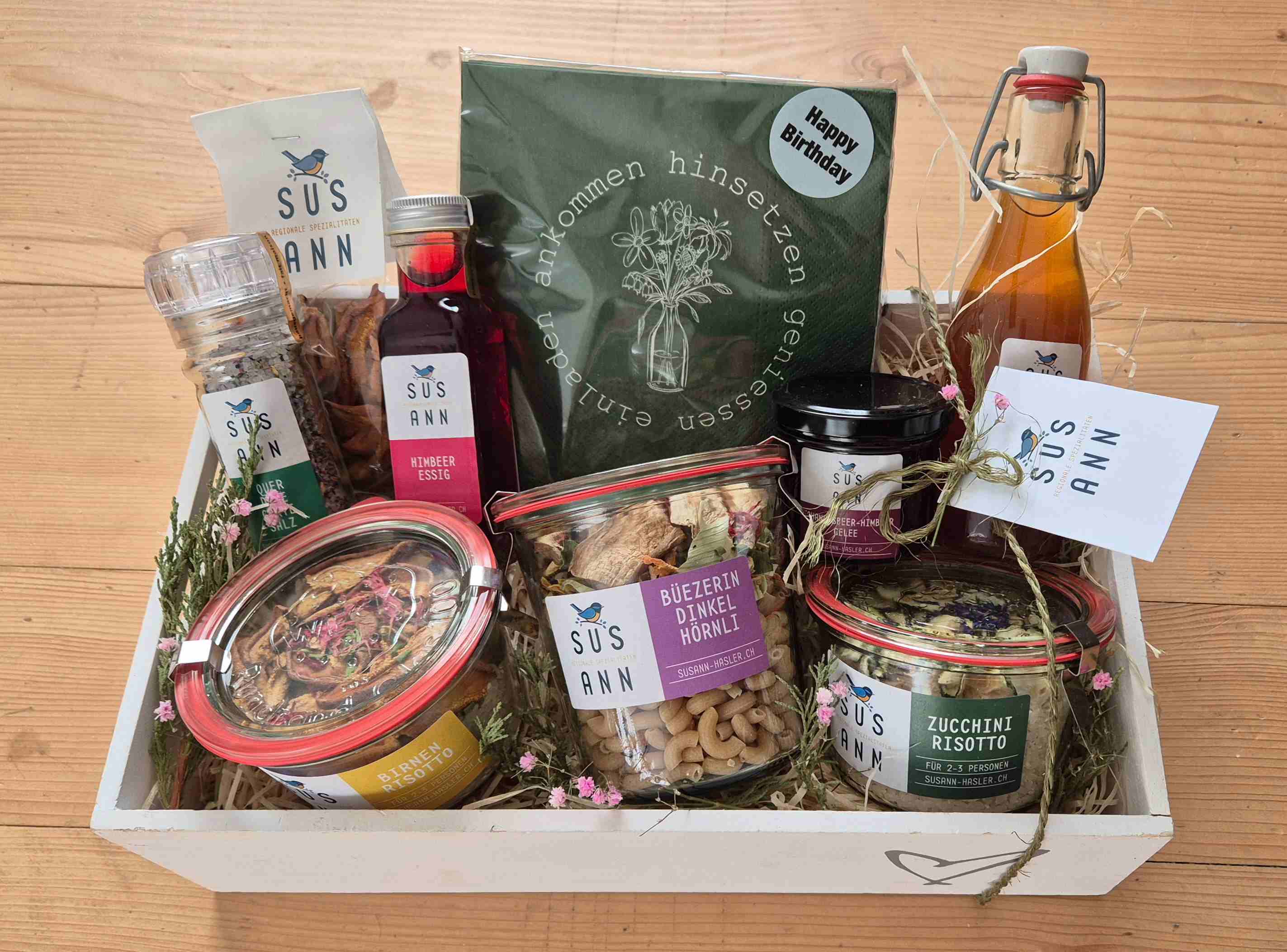 Verschenke kulinarische Freude mit diesem liebevoll zusammengestellten Geschenkset von SUS ANN – handgemacht in der Schweiz mit hochwertigen, natürlichen Zutaten. Ideal als Geburtstagsgeschenk oder als kleine Aufmerksamkeit für Feinschmecker.