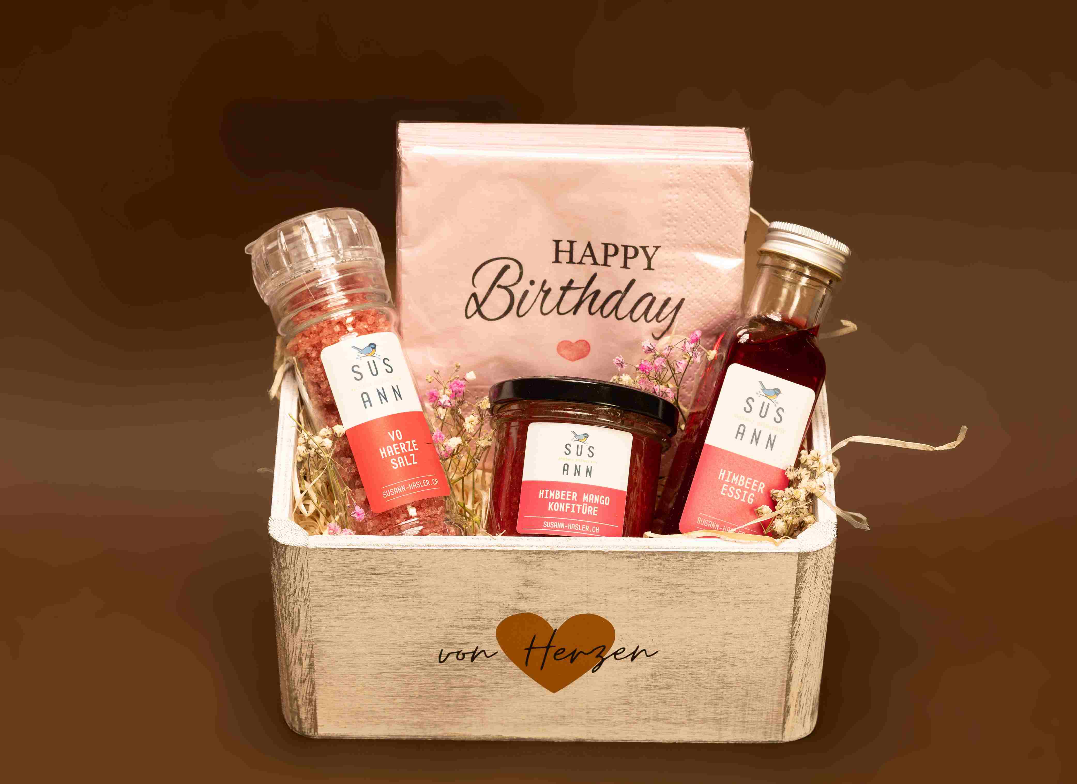 Verschenke kulinarische Freude mit diesem liebevoll zusammengestellten Geschenkset von SUS ANN – handgemacht in der Schweiz mit hochwertigen, natürlichen Zutaten. Ideal als Geburtstagsgeschenk oder als kleine Aufmerksamkeit für Feinschmecker.