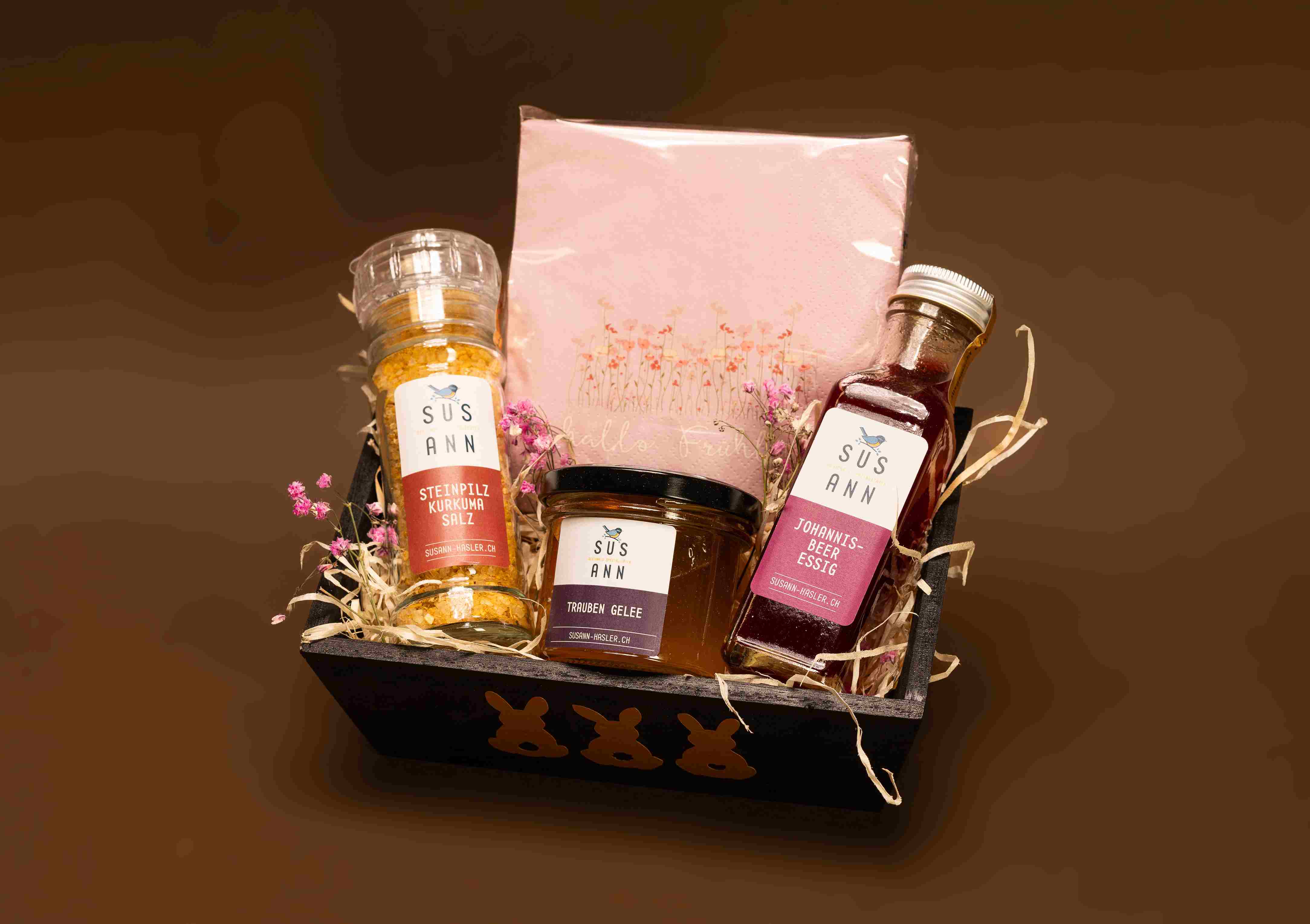 Verschenke kulinarische Freude mit diesem liebevoll zusammengestellten Geschenkset von SUS ANN – handgemacht in der Schweiz mit hochwertigen, natürlichen Zutaten. Ideal als Geburtstagsgeschenk oder als kleine Aufmerksamkeit für Feinschmecker.