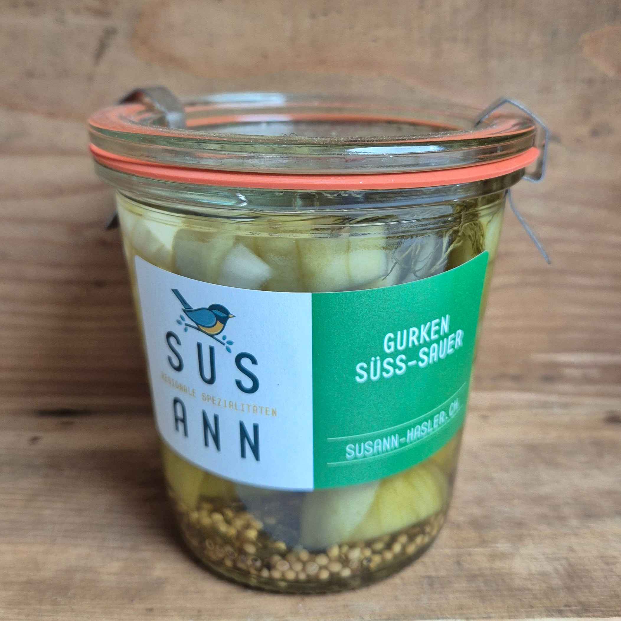 Zutaten (*CH): *Gurken, Weissweinessig, *Wasser, *Zucker, Senfkörner, Gurken-Gewürz, *Salz, *Zwiebeln, *Dill