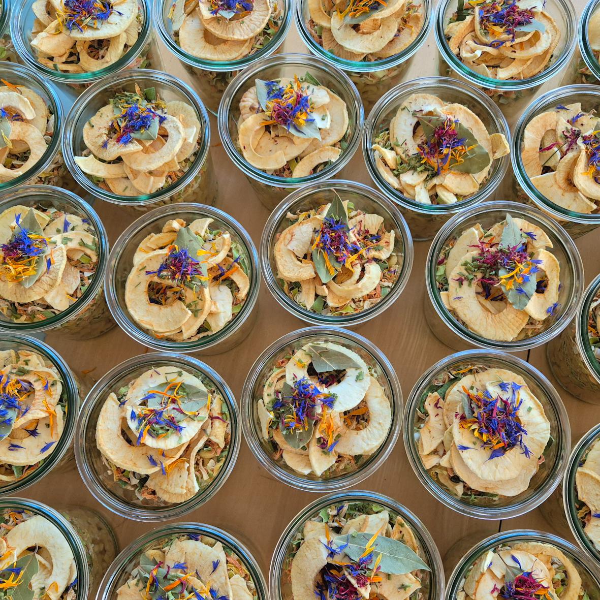 Zutaten (*CH): *Hörnli von der Härzblut-Pasta Manufaktur, *getrocknete Äpfel, *Zwiebeln, *Karotten, *Lauch, *Sellerie, *Schnittlauch, Lorbeerblatt, *Ringelblumenblüten